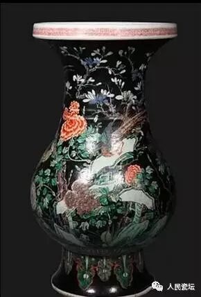 清康熙 墨地五彩雉鸡牡丹纹琵琶尊