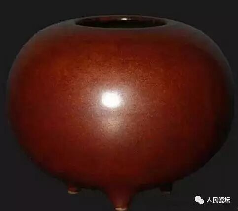 口径5.6cm;高10.7cm。小口,圆腹,紫金釉色纯正,三颗乳状垂足,古韵盎然。足内暗刻三行六字篆书款“大清雍正年制”。现收藏于观复博物馆。