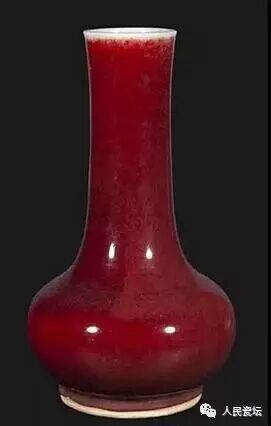 口径9.5cm;高38.5cm。釉色浓重艳丽,若牛血之初凝,又称“牛血红”。其以铜呈色,对温度和烧造气氛要求苛刻,成品率极低,时人谓之“要想穷,烧郎红”。此瓶直口,修长颈,垂腹,圈足。通施郎窑红釉,底足内施白釉,微泛黄并有细小纹片。器型高大,造型端庄沉稳,釉面深艳,玻璃光泽。现收藏于观复博物馆。