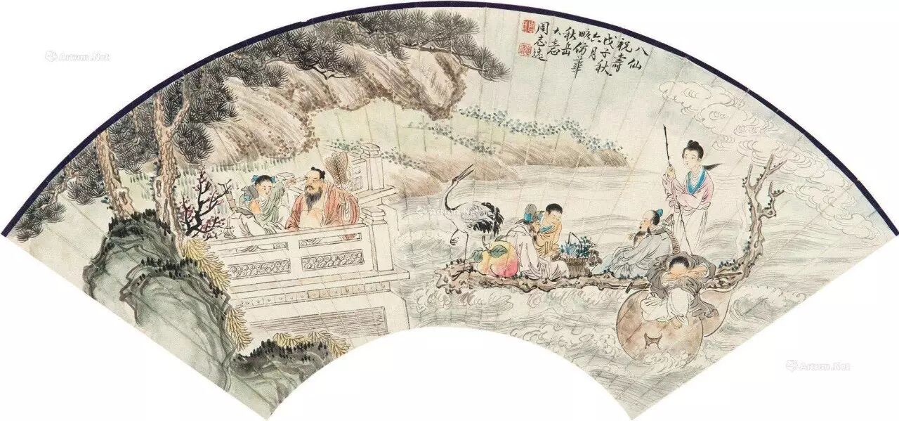 周志逸戊子(1948)年作八仙祝寿图/扇片