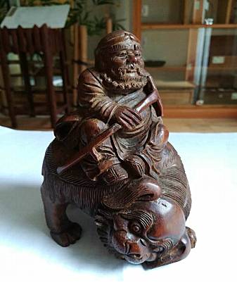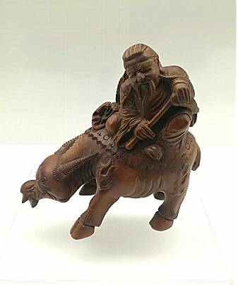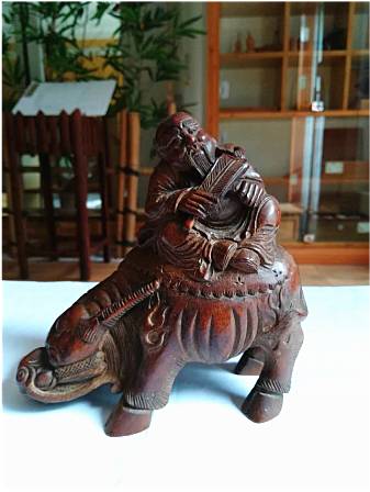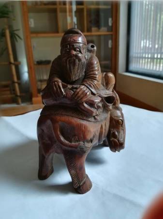 张果老是八仙中年事最高的一位, 中国民间传说他常背负一道情筒(鱼鼓),倒骑白驴,云游四方,宣唱道情,劝化度人。俗语“骑驴看唱本”就来源于此。他的坐骑白驴,日行万里,夜间折叠如纸,白天用水一喷,又还原成活驴。张国老的形象启示世人,凡事要懂得回头看看。