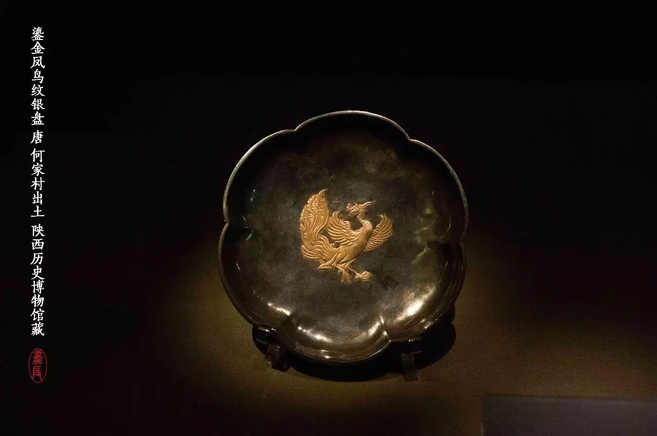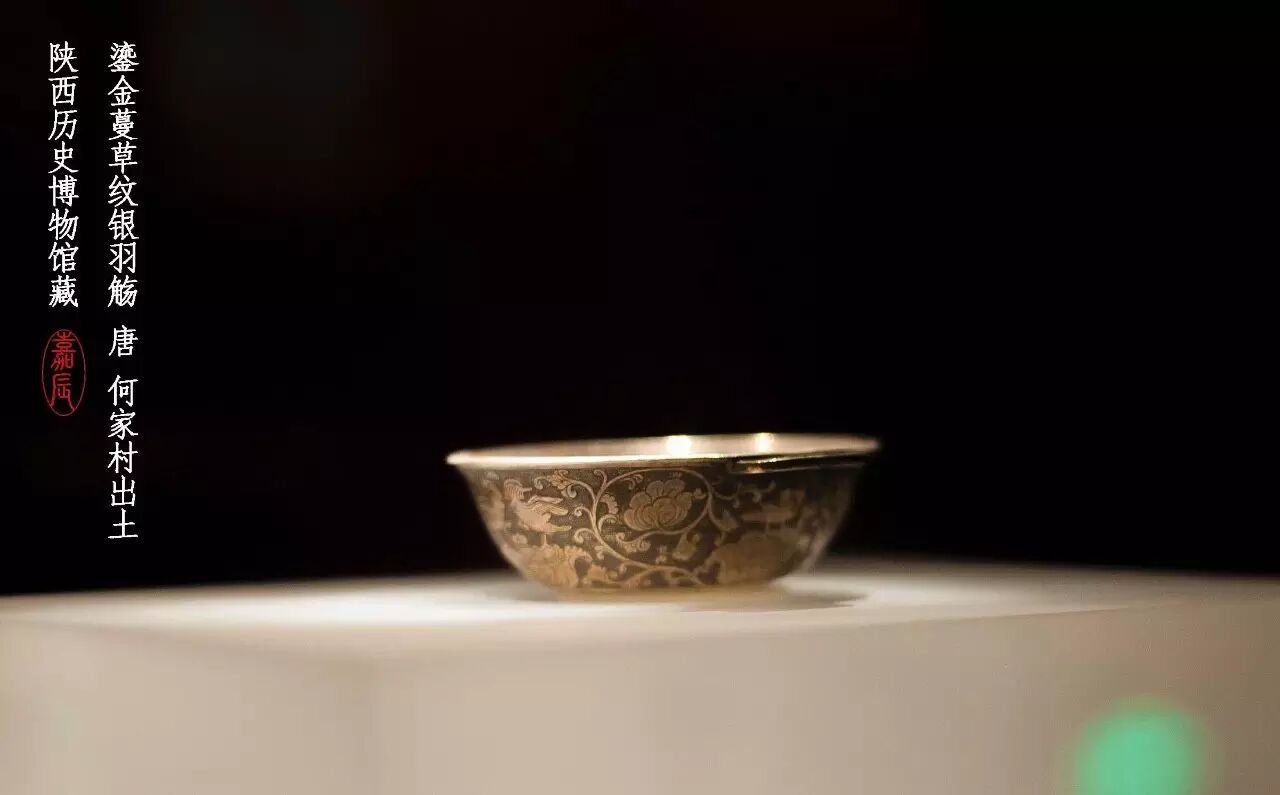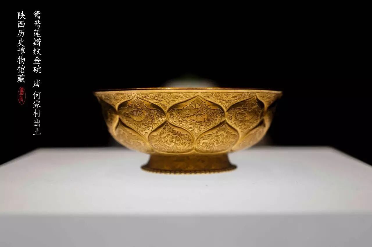 鸳鸯莲瓣鎏金碗(唐)何家村出土,在唐代,金碗有时被用作酒器,史料中也有一些描述,所以有人认为此碗是饮酒之器。金银器皿壁面捶揲出凸凹起伏的多瓣装饰,这种工艺起源于公元前6世纪的地中海沿岸地区,后来西亚和中亚的金银器制作继承了这些风格。金碗莲瓣华丽的纹饰,是典型的唐代风格,是迄今发现最为华丽的唐代金银器,为官府作坊所制。