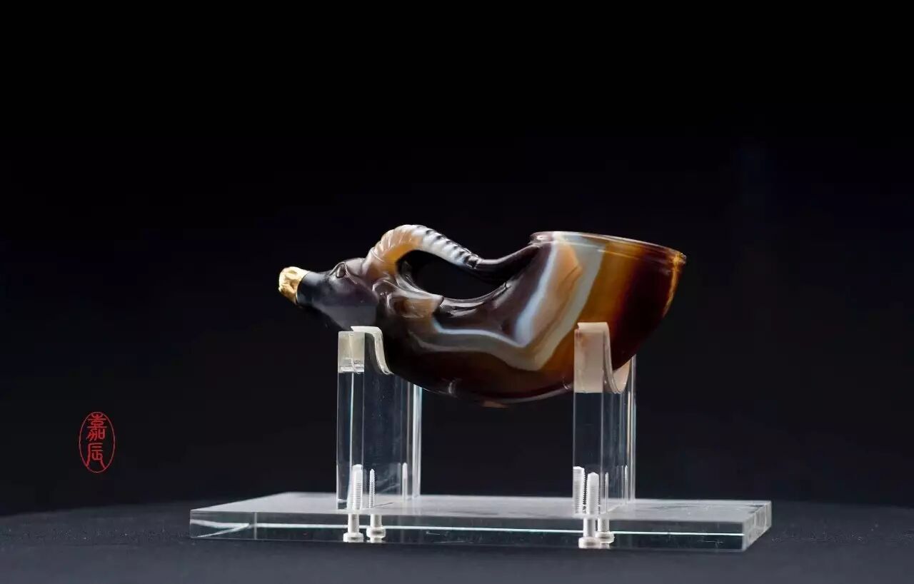 镶金兽首玛瑙杯。据说此物为镇馆之宝,用一整块酱红色、缠橙黄、夹带乳白色带的玛瑙制成,材料质地独一无二,弥足很贵。开口处注酒,兽首面部似牛,角却像羚羊角,嘴为黄金制成的酒塞,整体造型来源于希腊的“来通”。(来通,源于希腊语,是一种形似兽角用来装酒的酒器,传说中用它注酒可以防止中毒,举起来通一饮而尽表示向酒神致敬)可能是中亚某国进奉唐朝的国礼,意义非同一般,制作年代约为公元8世纪。
