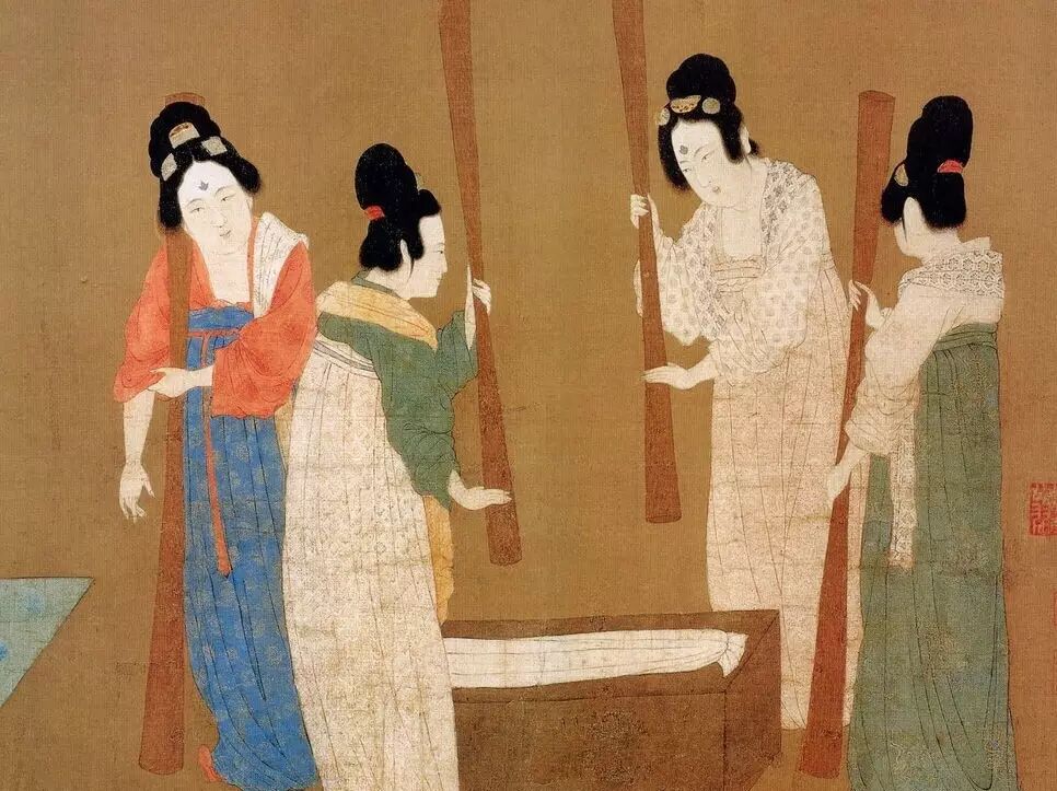 服装上,唐代时女性一般穿着襦裙居多,就是短襦上装+裙的组合,按裙腰之高低,则可分为齐腰襦裙、高腰襦裙与齐胸襦裙。《捣练图》看到的,是对襟齐胸襦裙。