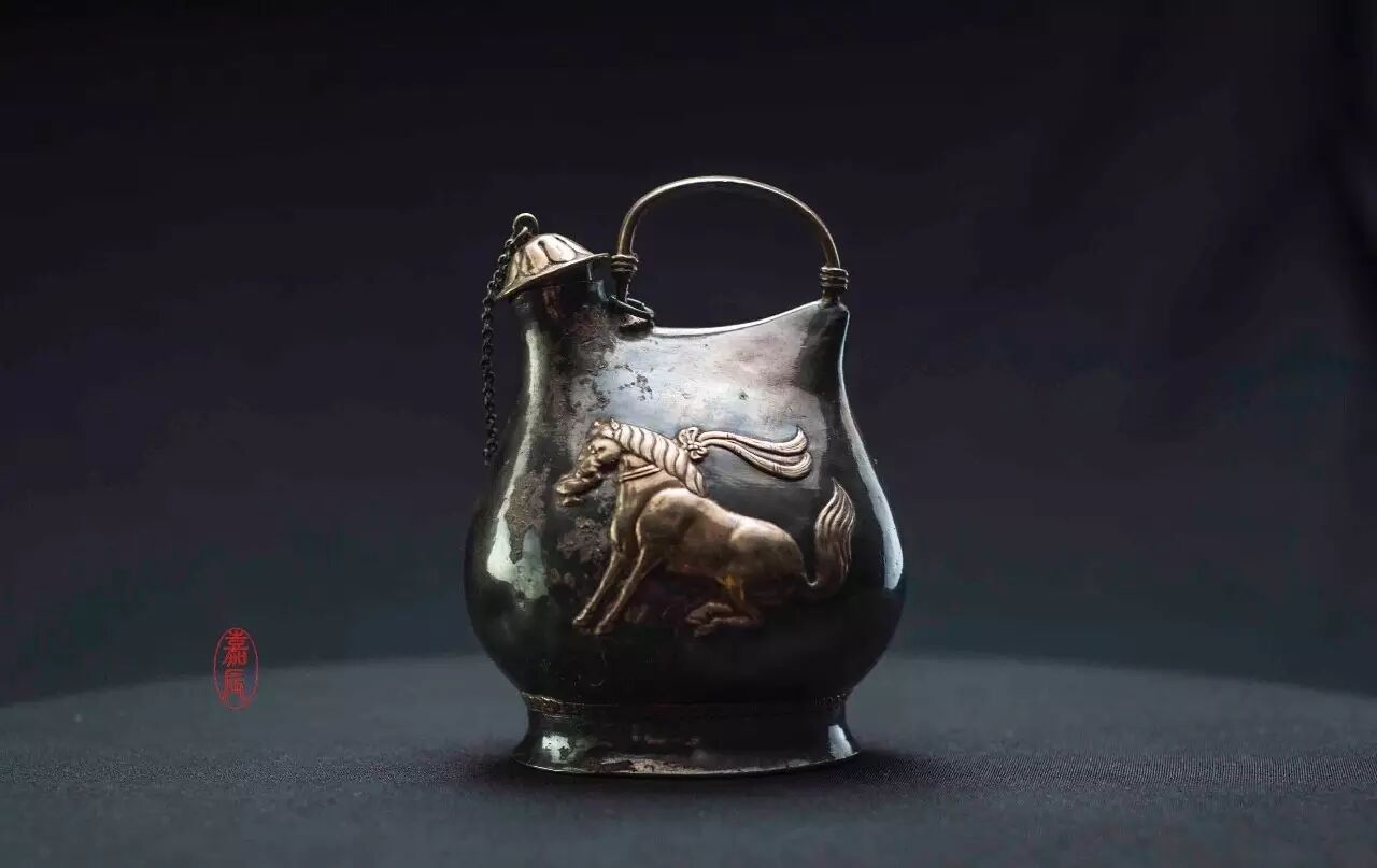 鎏金舞马衔杯纹银壶。造型借鉴契丹族的皮囊式,宴会上的酒器,也方便外出携带。银壶两面上的纹饰鎏金,扎着彩带的舞马屈膝,口中衔杯,做祝寿的样子。唐玄宗时期,舞马比较有名,据史料记载,当时宫廷中驯养了几百匹舞马,每年皇帝庆祝生日,马儿们披金戴银,伴着音乐翩翩起舞,曲终时,衔着酒杯,跪拜在地,向皇帝祝寿,生动的再现了歌舞升平的盛世美景。