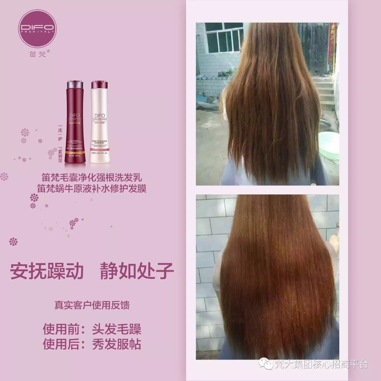 意大利笛梵(DIFO)专业高端美容洗护,头发打结缠绕不用怕,一洗一护后秀发恢复顺滑如泻。