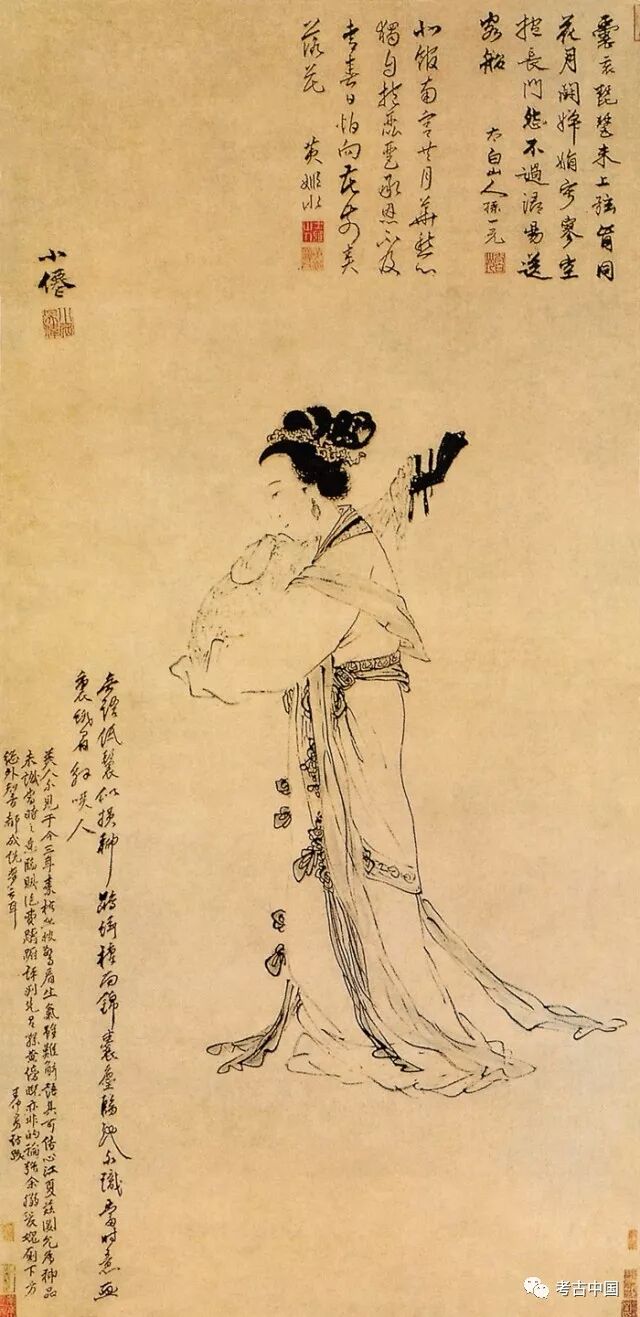 在表现技法上,此画属与工笔白描一体,略似北宋李公麟。但是较之画家早年的《铁笛图》,更加流畅秀润,风神俊爽。《画史会要》、《明画录》等著录。