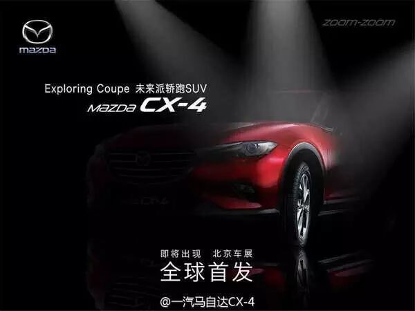 不同于其他汽车通过汽车网站发布预告图,一汽马自达则是在其微博上发布了一组CX-4的官方预告图。新车定位于轿跑SUV,将搭载马自达的创驰蓝天技术,并将于4月份开幕的北京车展全球首发。新车采用马自达最新的家族式设计,LED前大灯与镀铬装饰融为一体。A柱的黑色涂装将其营造出悬浮车顶的效果。