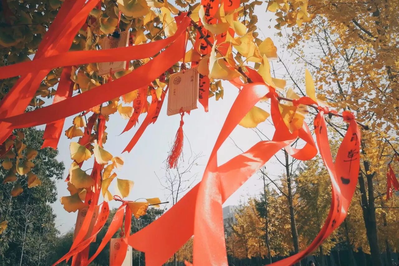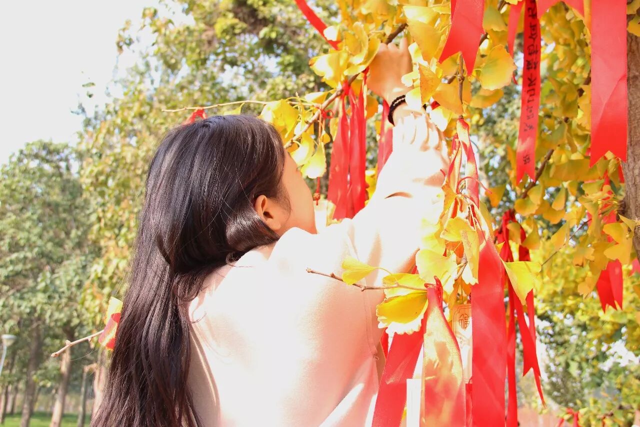在银杏节开幕式结束后,我们随着人流来到了挂红丝带许愿的银杏树下,来自工商管理学院的一对小姐妹贾玮丹与秦倩倩正在系丝带,玮丹写下的愿望是“长安长顺长相依”,希望自己以后会事事顺利时时平安,而倩倩与她的小姐妹一样许下顺利顺心的愿望,希望以后的日子越来越好。二人脸上都洋溢着幸福的笑容。希望她们心想事成,平安顺利,友谊常驻。
