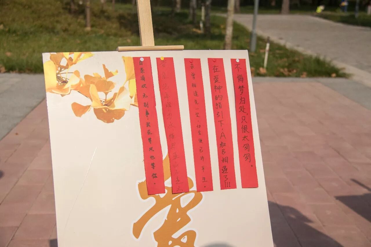 在“爱”的话题栏前,一张卡纸上写着“我在未来等你,秋风起,等过去”。2016级市场营销专业的一名女生轻轻在后边对应了一句“满地黄花堆积,雁过也,最伤心”。她说喜欢这种与陌生人的巧妙互动,也很喜欢秋天。说着和旁边的男生相视一笑。祝福他们一起走过更多春夏秋冬。