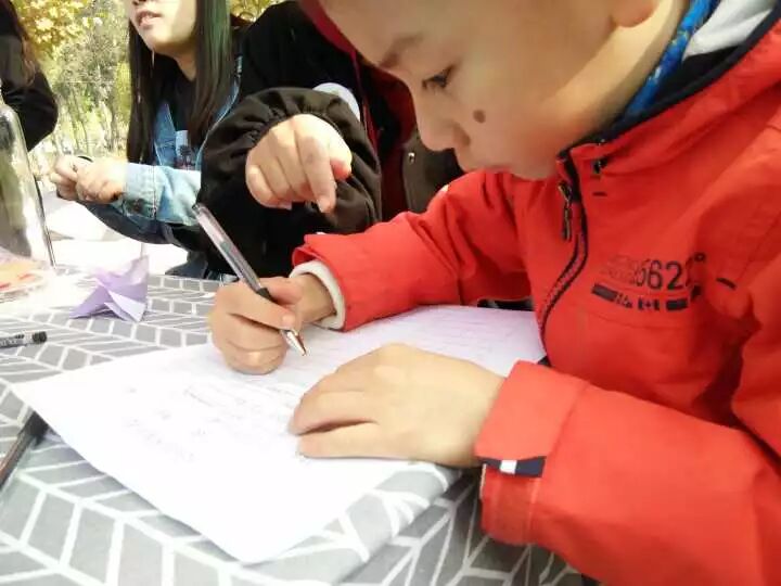 我们还遇到了刚上幼儿园中班的亮亮小朋友,他和爸爸妈妈、爷爷奶奶一起,趁着周末的悠闲时光,来到经贸校园,观银杏之秋,赏经贸底蕴。在c教后花园里的“以银杏之名,寻时光之痕”的时光瓶许愿活动地点,小朋友一笔一画用稚嫩的文笔写下了对全家最美好的祝福。你知道吗?世间再多美景,都不及你我爱的人幸福平安,安康如意。