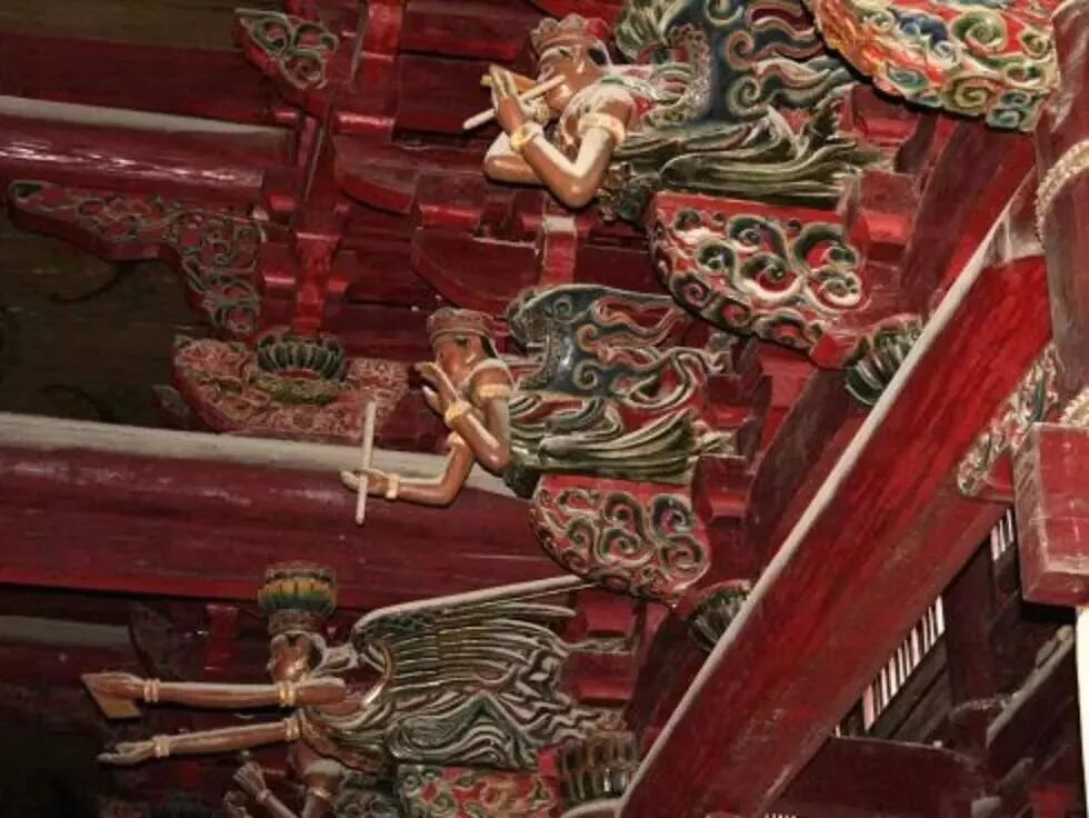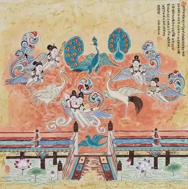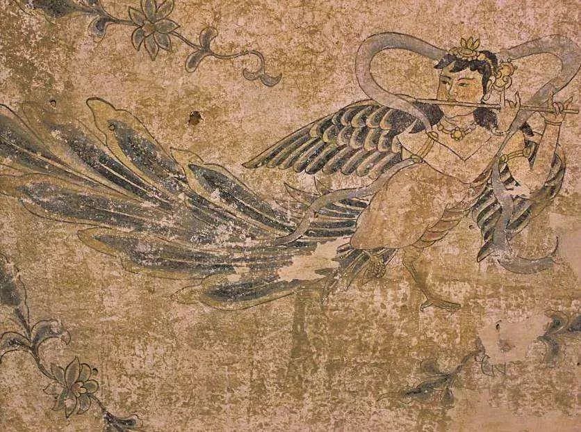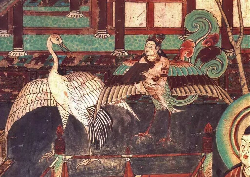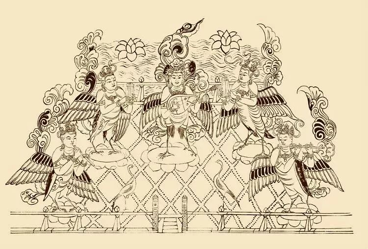 敦煌莫高窟很多洞窟里的壁画中,就有妙音鸟。。其他有吹奏排箫的、吹奏横笛的、拿着像新疆维族乐器冬不拉演奏的、双手持拍板击打的等。
