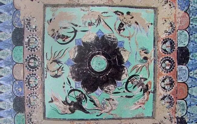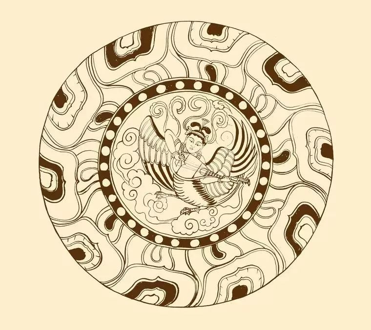 莫高窟第360窟藻井主室覆斗顶,中心为一朵卷瓣莲,莲心绘妙音鸟,怀抱曲项琵琶,展翅飞翔于彩云之间。