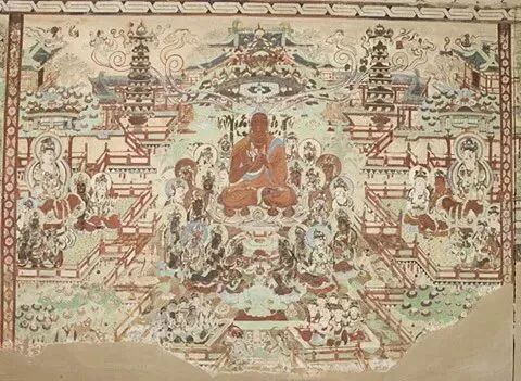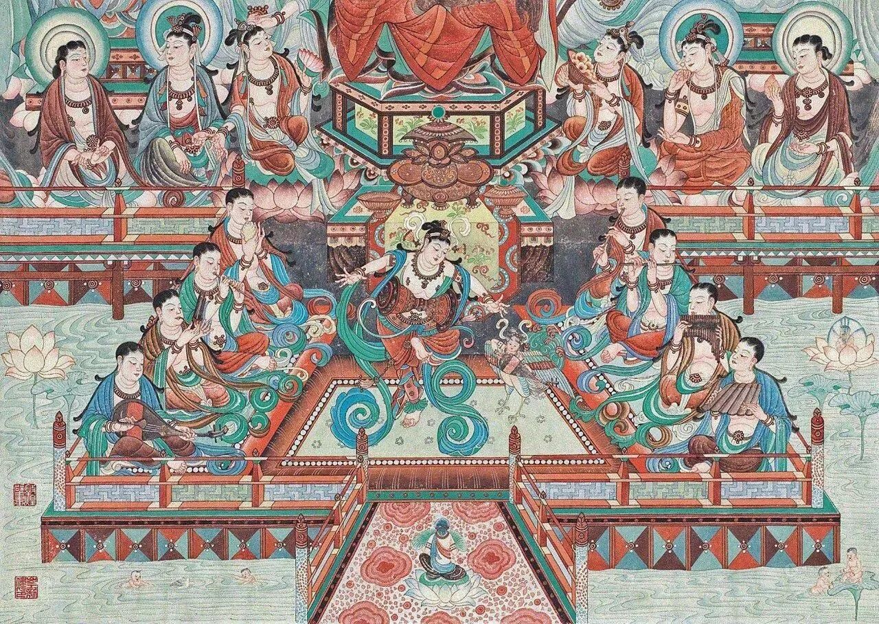 莫高窟第45窟北壁正中绘制极乐世界图,,四周围绕听法的圣众,两侧有观音、大势至两大菩萨相封而坐。