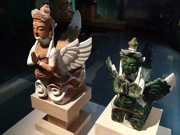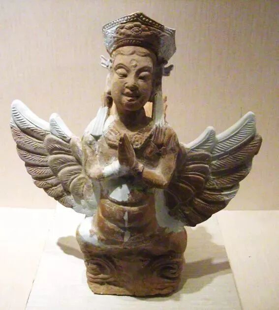 鸟身人首的乐伎造像,上半身为人,下半身为鸟,身体类似鹤,两腿修长,双翅,头部是童子或者菩萨形象。