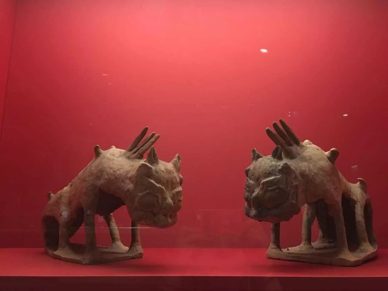 兩件鎮墓獸形制相同,作站立狀,頭部下垂,用浮雕的手法表現出眼、鼻、牙齒,雙耳豎起,背脊部向前有三根向上豎起的棒狀角,有異域風格。