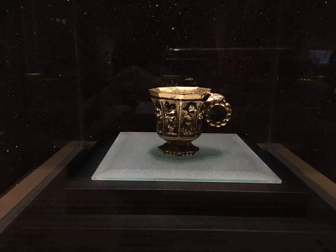 杯上樂工手執的豎箜篌、曲項琵琶、排簫等都來自於西域,而樂伎的服飾和髮式則具有粟特特色,是當時中外文化交流見證。
