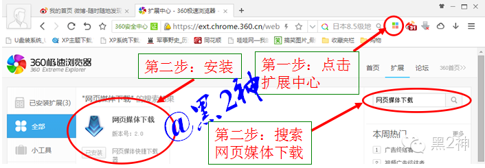 1.第一步下载360极速浏览器,安装后打开浏览器,点击右上角扩展中心,然后搜索网页下载媒体,点击安装。