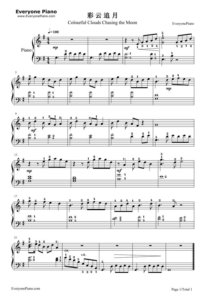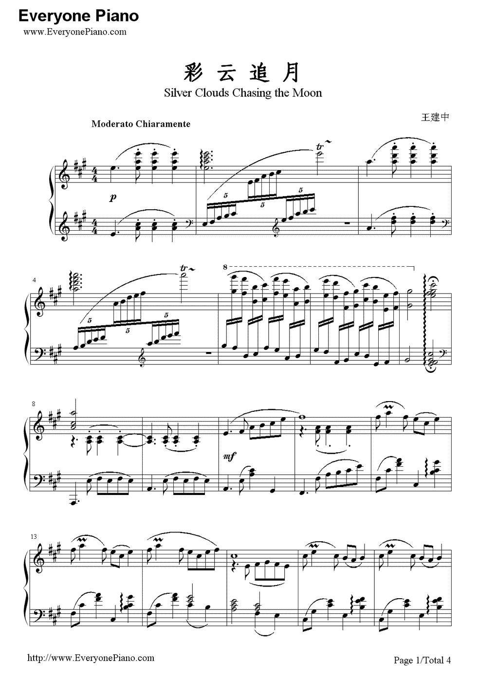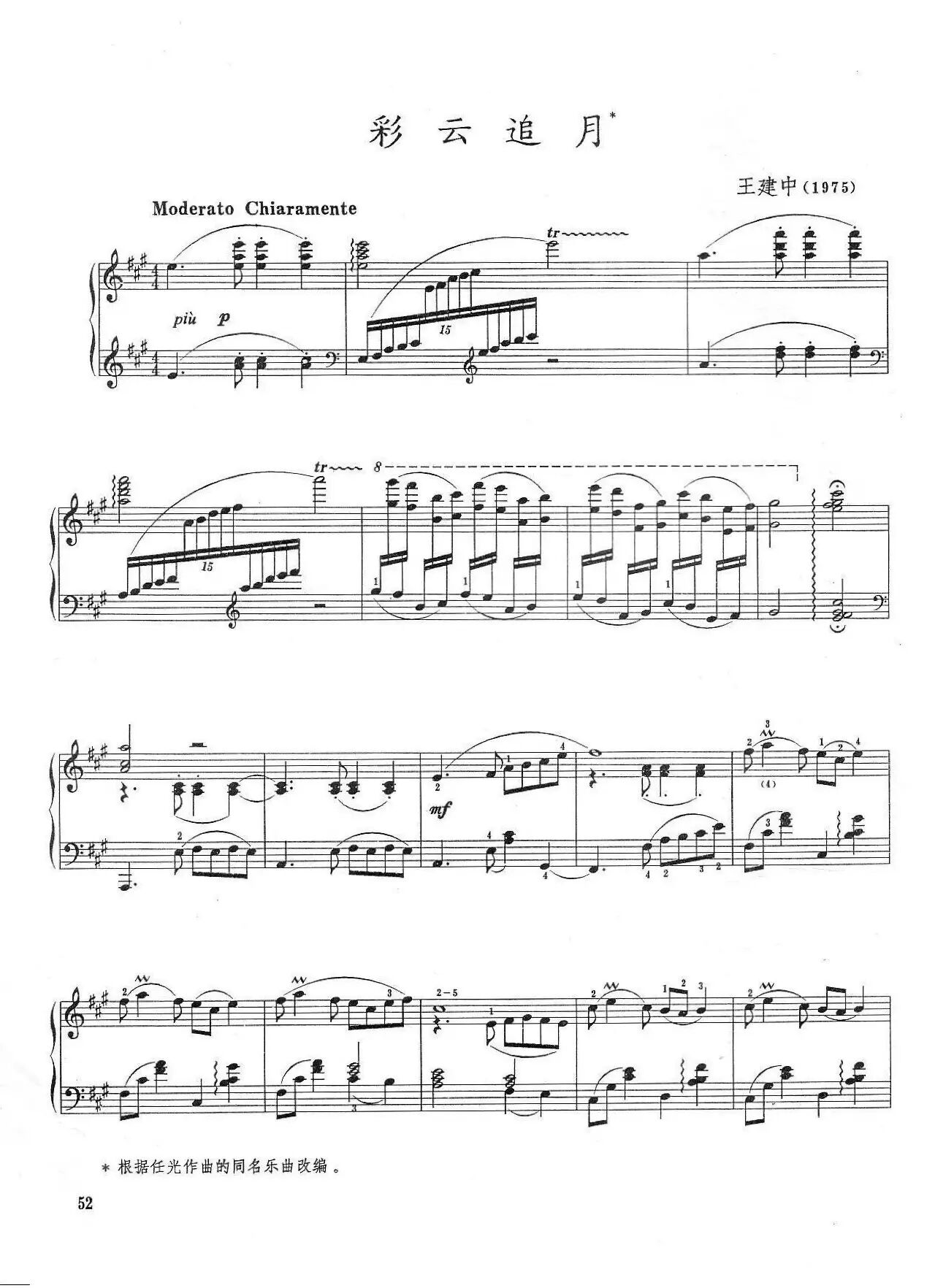 《彩云追月》原本是一首民族管弦乐作品,1975年我国著名作曲家、钢琴教育家王建中先生将其改编为一首同名钢琴曲。通过他娴熟和高超的创作改编手法,很好地将民族音乐旋律与钢琴这件西洋乐器融合在了一起,被广大钢琴演奏者和欣赏者所喜欢,堪称中国钢琴作品中的艺术精品。