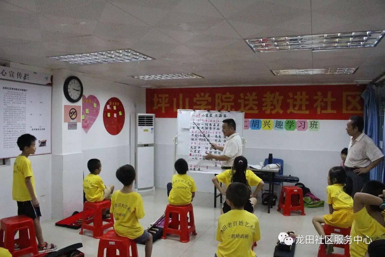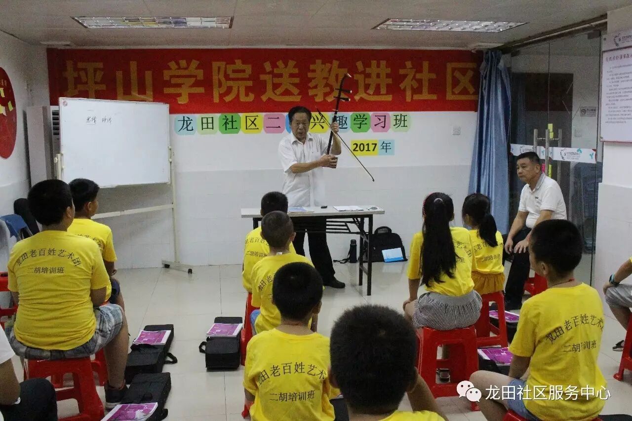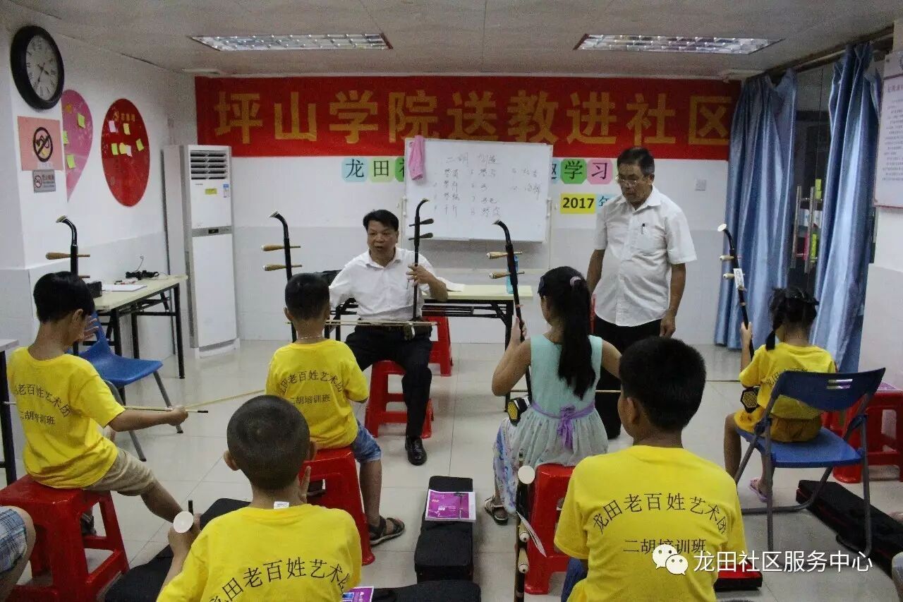 2017年7月12日至2017年8月13日期间,龙田社区党群服务中心联合老百姓艺术团组织开展了一期二胡公益学习班,共有13名儿童青少年参加学习。