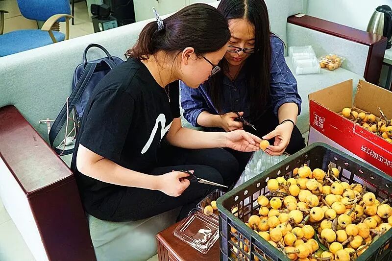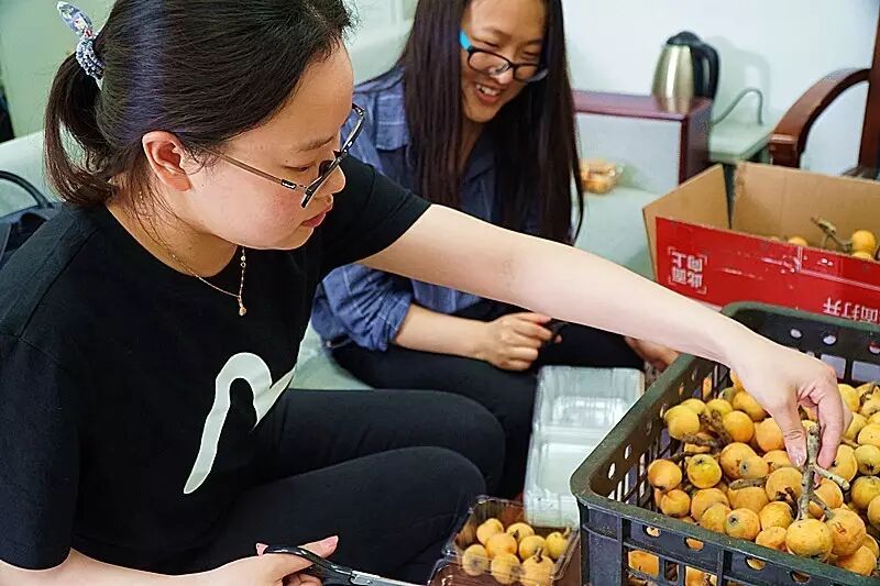 新媒体工作室的同学把一大筐的枇杷进行了认真分装。