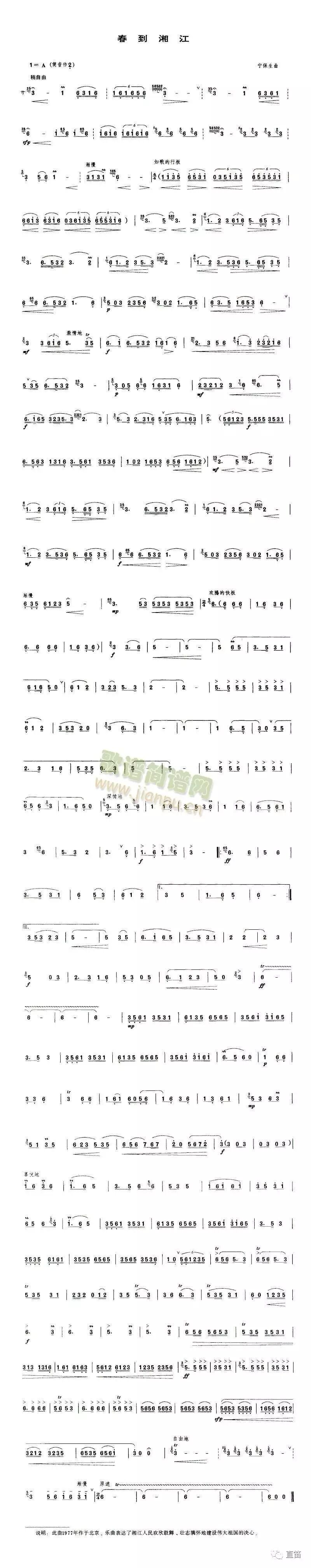 《春到湘江》是宁保生先生1976年创作的竹笛名曲,另有古筝演奏家王中山根据其改编的古筝曲。自问世以来,就以其鲜明的湖南花鼓音乐特色,时而激情如火,时而流畅清雅的旋律,引起了全国广大笛子演奏者的热烈反响,并受到了笛子爱好者的特殊青睐,不但被多种笛子出版曲集争相出版,而且还成为众多笛子演奏家的演出保留曲目和许多音乐院校的笛子教材,还被编入近年普及全国的笛子考级七至八级的曲目之中,成为了青少年业余笛子学习队伍中佼佼者们所喜爱演奏的曲目之一和报考许多音乐院校笛子专业的热门选曲。