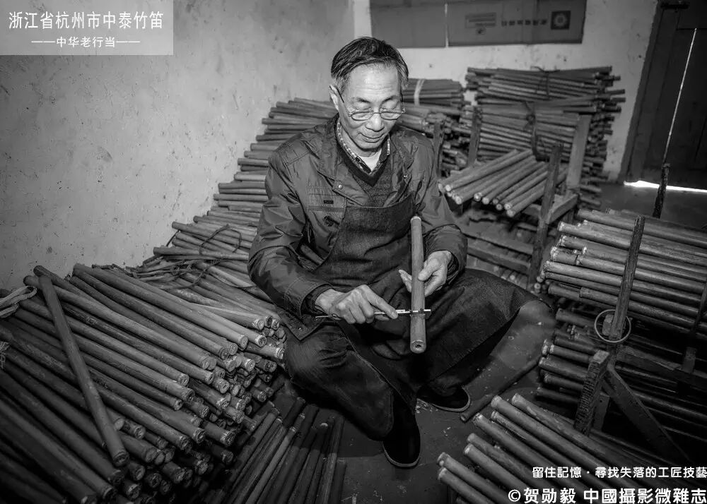 董师傅在粗选尺量合适的苦竹,阴干3年以后烘烤压直、定调细选