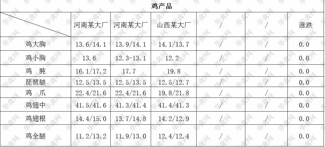 河南 | 板冻大胸13500;鸡大胸13000-13500; 琵琶腿12000-12200;翅中39000-40000 |