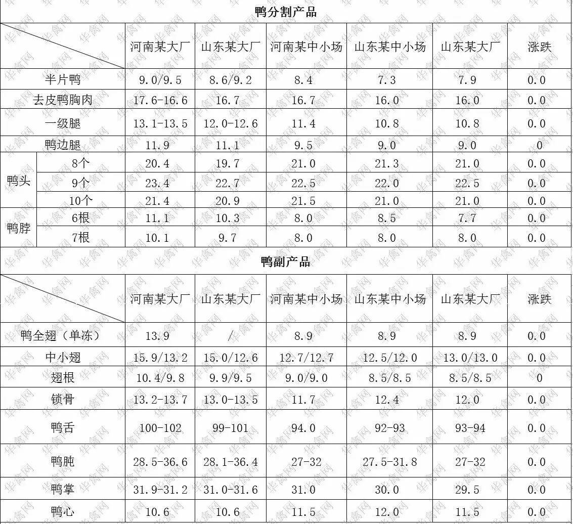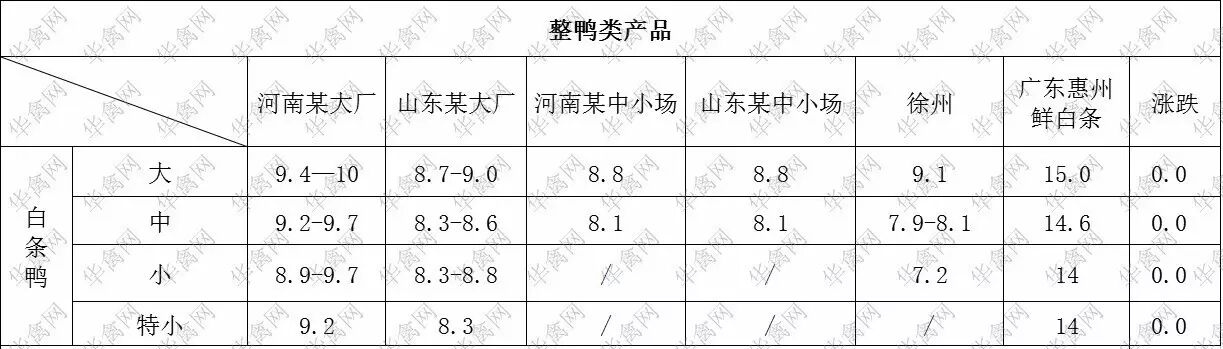 今日白条及鸭产品各大厂报价一手报价持稳。