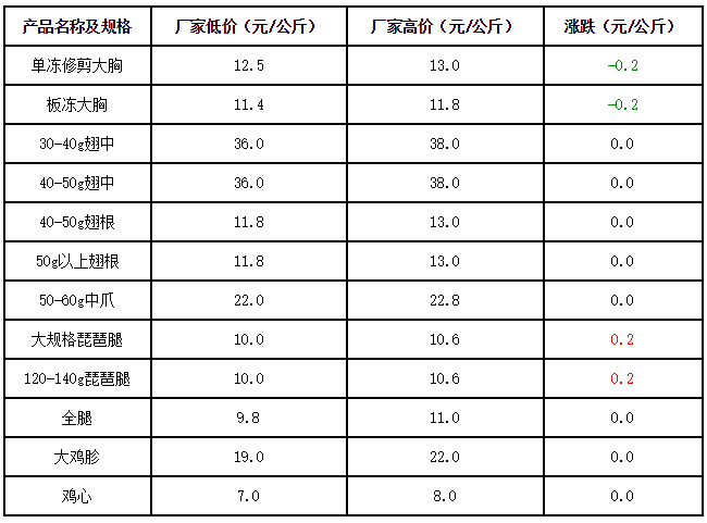 东北 | 板冻大胸11500-11800;单冻大胸12500-13000; 大规格琵琶腿11000-11500;翅中36000-38000 | ||