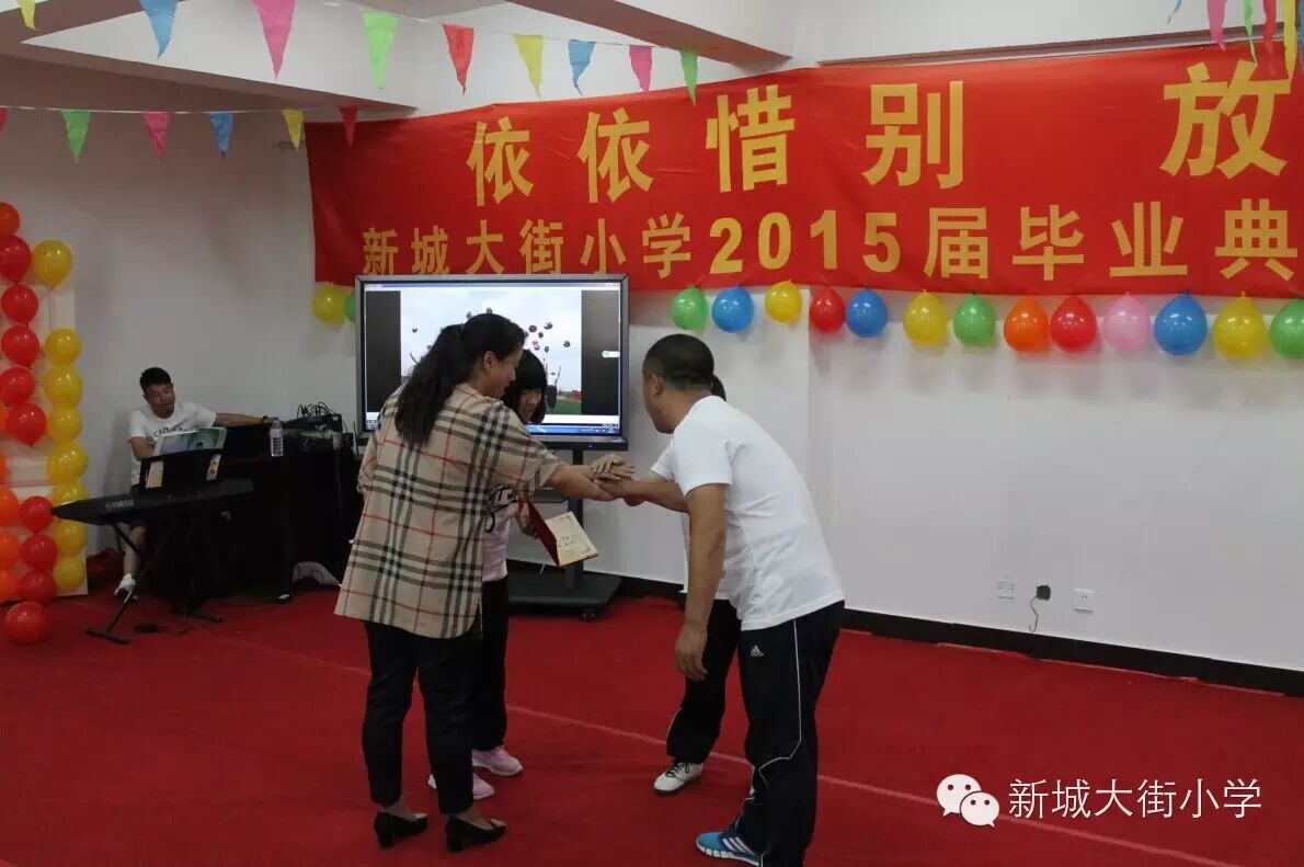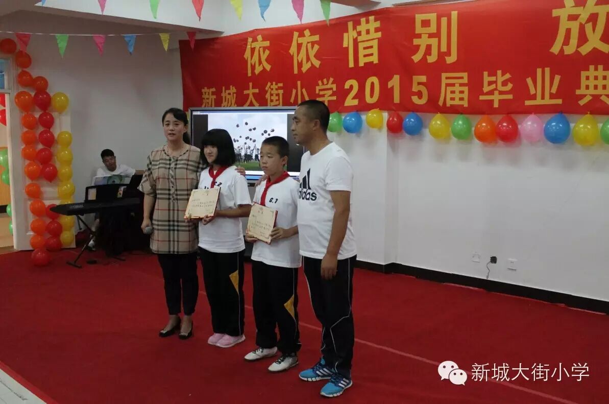 宣读了“优秀毕业生”名单之后,由新城大街小学党支部书记冯玉梅和王洪国老师为获奖同学颁奖。(下图)