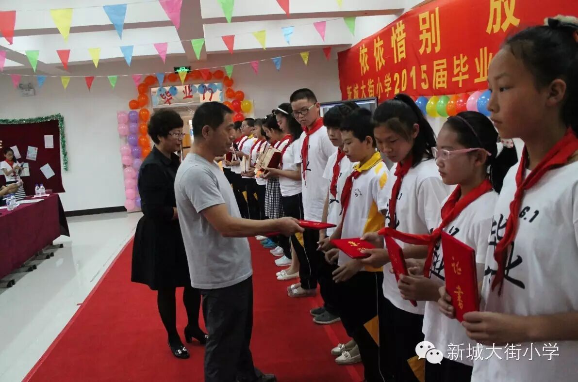 当时间的脚步定格在2015年6月,又是一个毕业季,又到了将要离别的日子。新城大街小学2015届毕业班的所有老师和69名毕业生,载着对6年时光的美好回忆和对未来的无限憧憬,在为期一个月的毕业季系列活动中“依依惜别,放飞梦想”。
