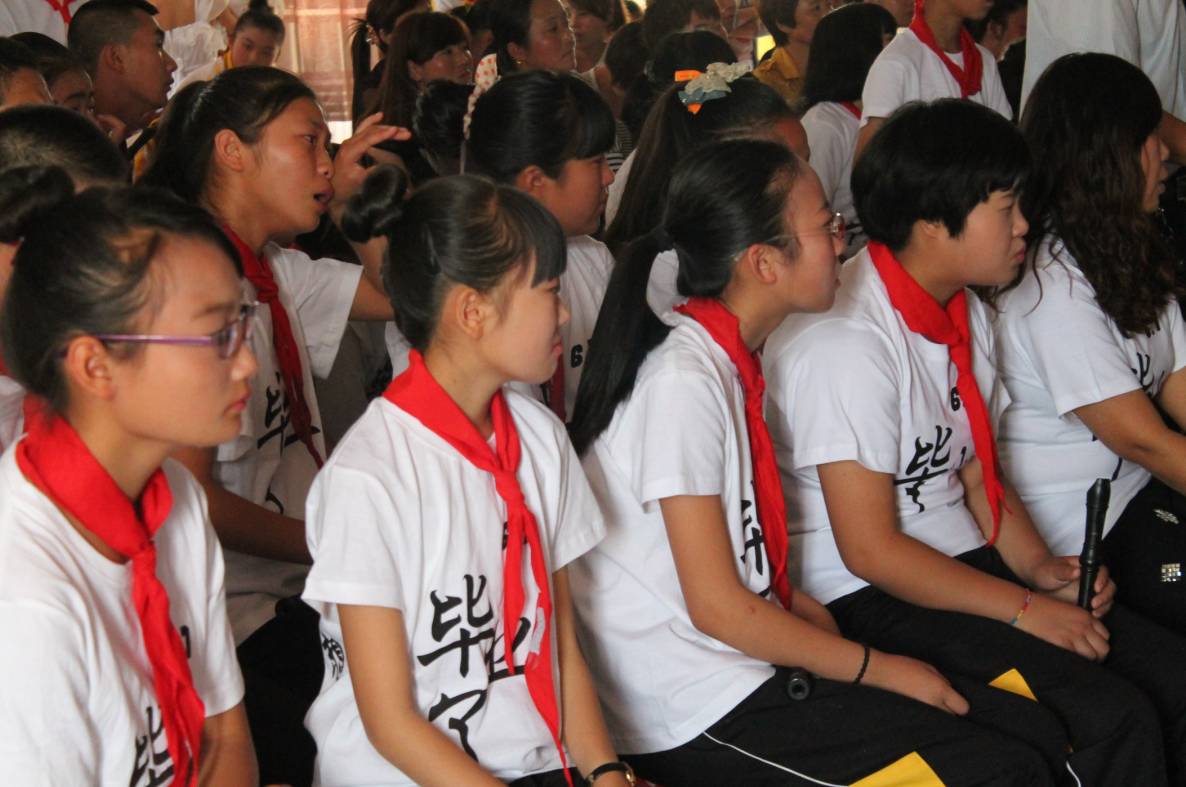 在毕业班献词的环节,师生一起回忆了六年每一个让人梦绕魂牵的瞬间。毕业生们心中有千言万语要倾诉,有无限感恩和离别之情要宣泄。此时,大屏幕上播放了精心制作的《老师,我想对您说》视频,他们对每一位任课老师表达了一份浓浓的感恩之情,随着“匆匆那年”音乐的响起,视频中是他们六年来在校的点点滴滴,此时,毕业班所有师生积蓄了一个月的情感终于突破桎梏,到了爆发的时刻,每一位孩子都流下了感动与感恩的泪水,当全体毕业生带着泣音的一声“老师,您辛苦了”,也让每一位任课教师都抑制不住情感掩面而泣,同学们将鲜花献给老师,和他们拥抱,倾诉、宣泄着情感,而参加本次活动的来宾及家长也被这个场面深深触动,落下了感动的眼泪。(下图)