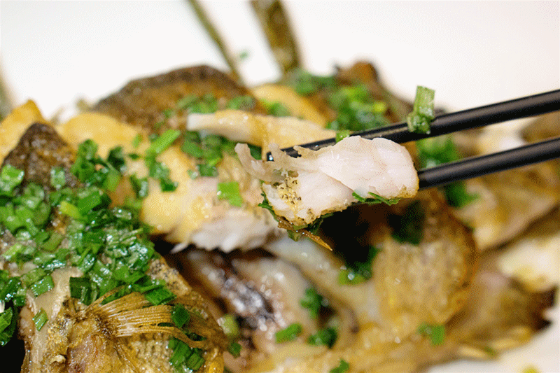 ▲厚实的鱼肉由于经过长时间的腌制十分入味,并且煎制之后的鱼皮酥脆,鱼肉鲜嫩。再搭配香煎的葱和葱花,简直香~