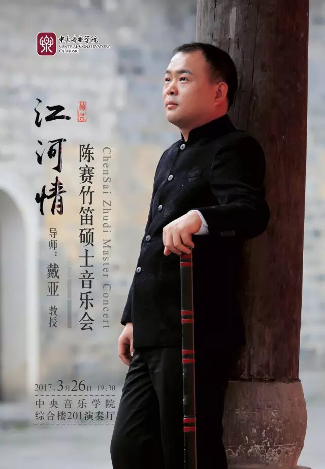 【笛友之家讯】:(记者 刘墨)“江河情”陈赛竹笛硕士音乐会将于3月26日(星期日)19:30在中央音乐学院综合楼201演奏厅举办。欢迎各位莅临指导!