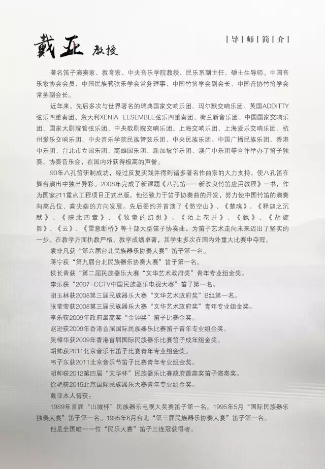 2015年考入中央音乐学院民乐系攻读笛子专业硕士研究生,师从著名笛子演奏家、教育家、硕士生导师戴亚教授。