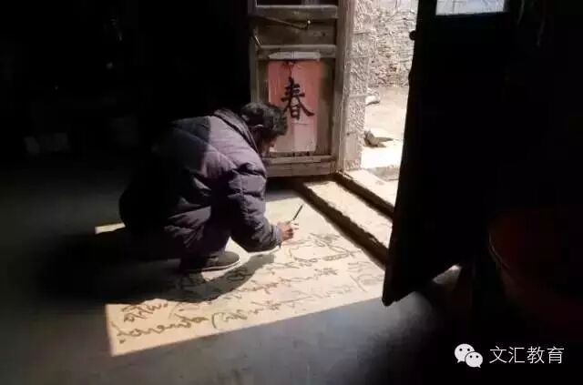 杜深忠借着透过门框射进来的光影在地上练习书法。