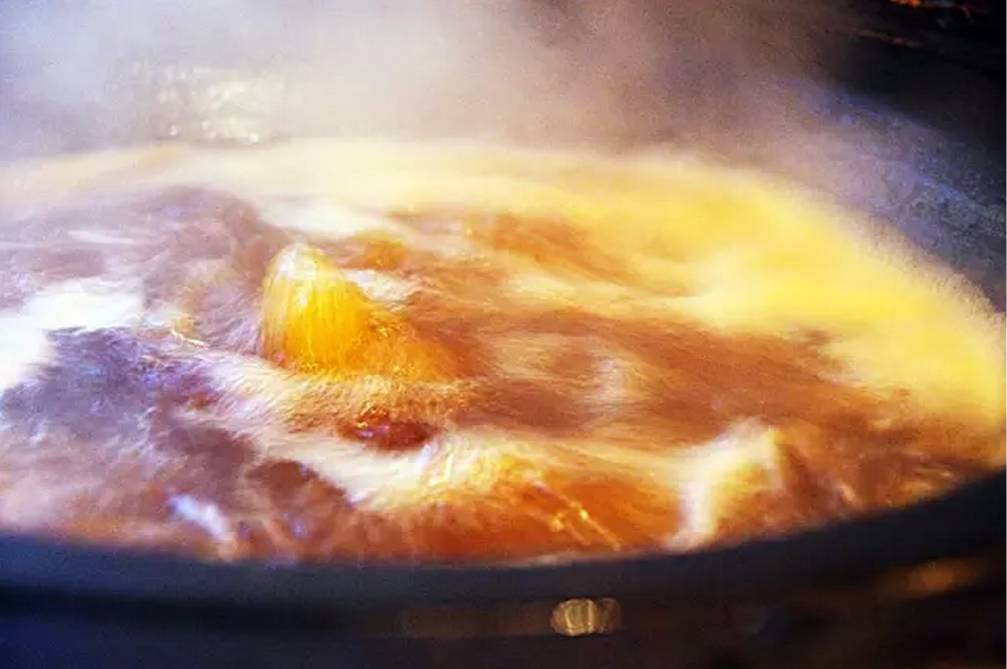 现在一般都是烧柴火来熬,一锅枇杷膏汁得熬上一夜,家里人轮流守着,火不能太旺,否则会烧糊烧焦,中火最适宜。