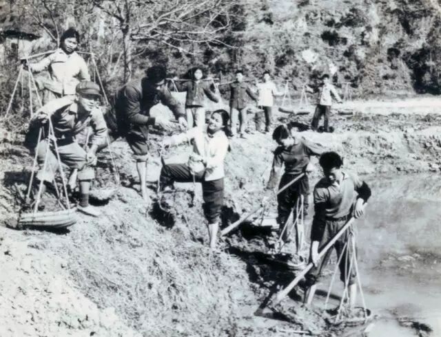 知青参加农田基本建设。前排左起:牧山、善红(场长)、苑芳(队长)、阳春、桂明。后排左起:小梅、思娟……