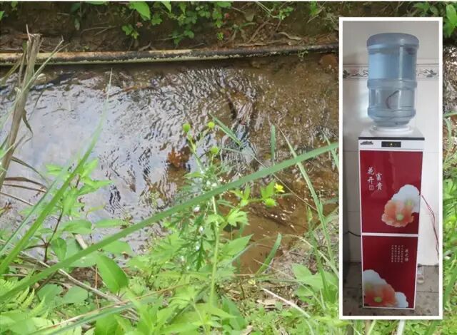 这里有清澈甘甜的山泉。应中他们拿水管从源头接出来,变成桶装水,直接喝。