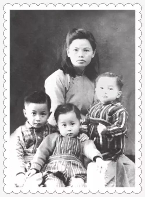 母亲与三个可爱的孩子合影。左起君夫、英夫、秀夫。