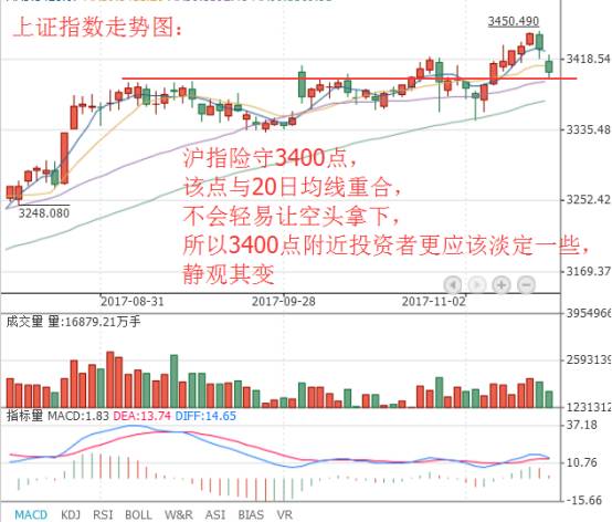 技术方面:“3400点与20日均线重合,不会轻易让空头拿下,所以3400点附近投资者更应该淡定一些,6连涨提示了风险,现在调整如日而至,机会自然伴随而来,心地清净方为道,退步原来是向前”,午后各大指数均有扩大跌幅,但是并未见恐慌盘涌出,成交量明显萎缩的情况下,指数却走出了中长阴,重心大幅下移,这说明一抛压不大,二市场承接力太弱,少量的筹码就让市场再下台阶,主要原因是连续上涨,内在的蓄势整固的需求,而且3400点这个战略点位需要反复夯实,方能更好的前行。3400点尚未失守,可以用来做诱空,诱空后价格还将沿着趋势运行。创业板又一根断头铡刀,一阴穿5线,指数演变趋向恶劣,但不必过度悲观,跌出来的机会,涨出来的风险,年线下方的创板越低越是机会,均线只要短期快速收复回来,无非就是诱空骗筹的伎俩,股票投资很微妙,总能360度全方位挑战人性一切弱点,短线修复技术指标的超买,随时止跌企稳再次反弹,捕捉板块轮动中的交易性机会。