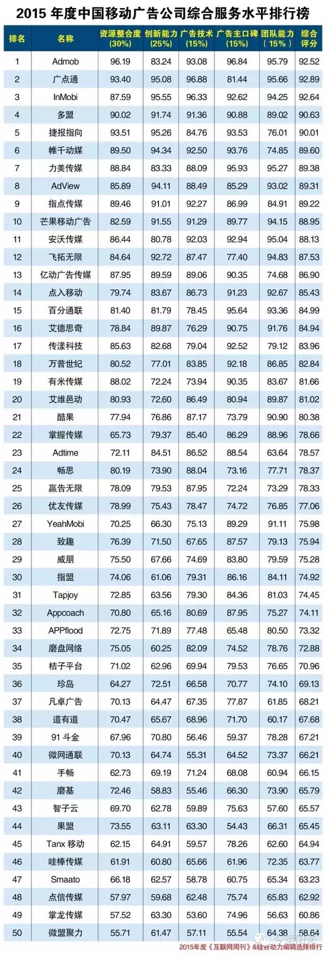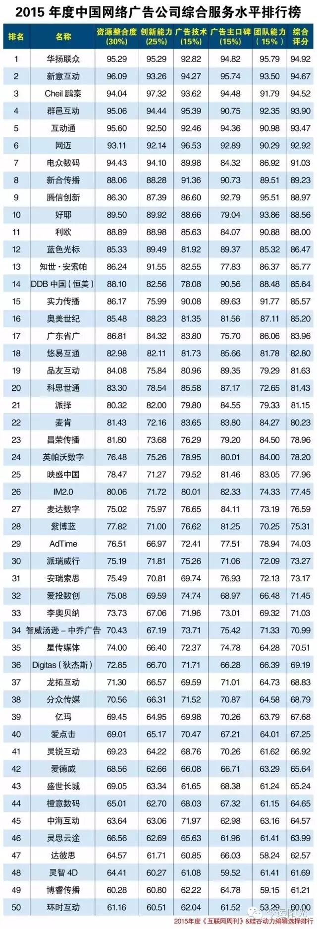 近日,国内权威杂志《互联网周刊》就根据资源整合度、创新能力、广告技术、广告主口碑和团队能力等对中国网络广告公司和移动广告公司进行综合评估,并最终评选出整合发展力前50名的广告公司。