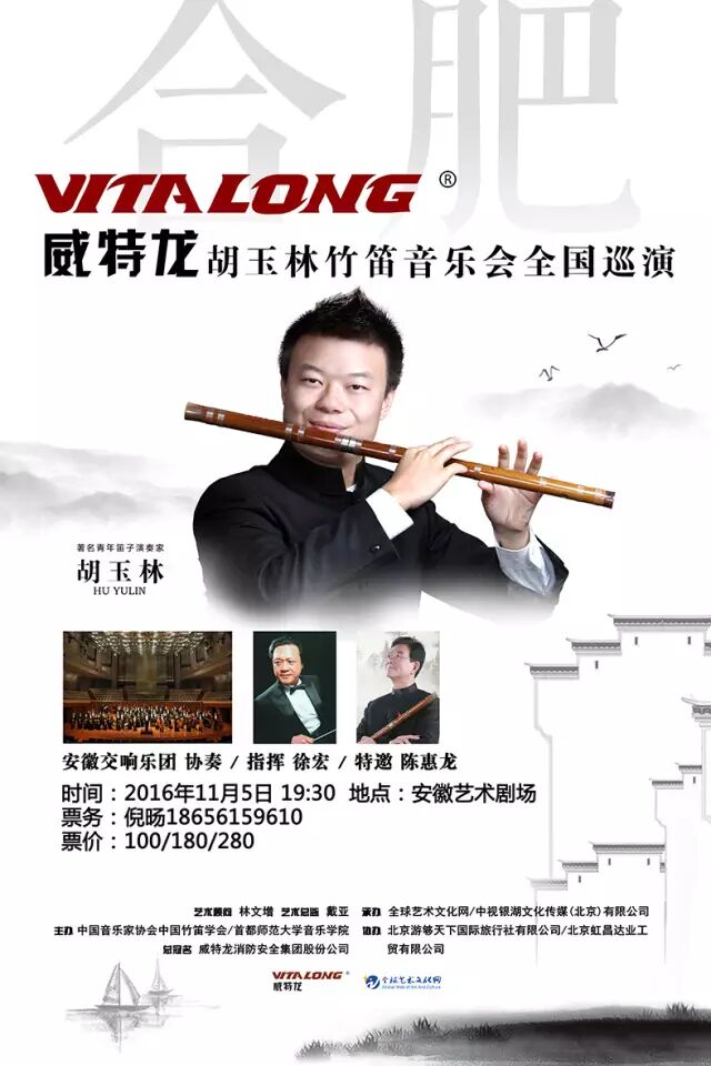 2016胡玉林竹笛音乐会全国巡演第六站将于11月5日晚7:30在安徽艺术剧场隆重举行。 全国巡演合肥站特邀著名笛子演奏家陈惠龙助阵,著名指挥家徐宏先生执棒指挥,安徽交响乐团协奏。音乐会将展示不同风格、不同意蕴的作品,给观众带来一场竹笛与交响乐团交相辉映的视听盛宴。 此次全国巡演由中国音乐家协会中国竹笛学会、首都师范大学音乐学院主办,全球艺术文化网、中视银湖文化传媒(北京)有限公司、杭州铜音竹笛文化艺术研究院承办,北京游够天下国际旅行社有限公司、北京虹昌达业工贸有限公司、安徽省民族管弦乐学会协办,安徽省竹笛专业委员会支持,中国音乐家协会竹笛学会会长、著名笛子演奏家林文增担任艺术顾问,中央音乐学院教授、著名笛子演奏家戴亚担任艺术总监,威特龙消防安全集团股份公司总冠名。 此次音乐会不仅有《秦川情》、《走西口》、《皖乡恋歌》、《三五七》等代表地方特色的经典曲目,也有《叹》、《天雨》、《苍》等抒发作者人生感怀的近现代作品。音乐会曲目风格各异,相信会给观众带来不一样的感受。 中视银湖文化传媒(北京)有限公司