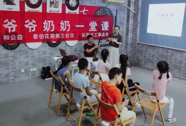 “爷爷奶奶一堂课”是和公益的品牌项目,旨在让老人给孩子上一堂乡土文化课,让孩子从老人的故事里找到自己的根。乐助社工通过好公益平台引进该项目,由专业社工策划和引导,让本地老人开展乡土教育,包括“二胡吴韵”、“吴歌畅享”、“锡剧曲调”、“竹笛悠扬”四个主题课程。让孩子对其生长、生活的社区产生价值认同,让传统文化得到传承。