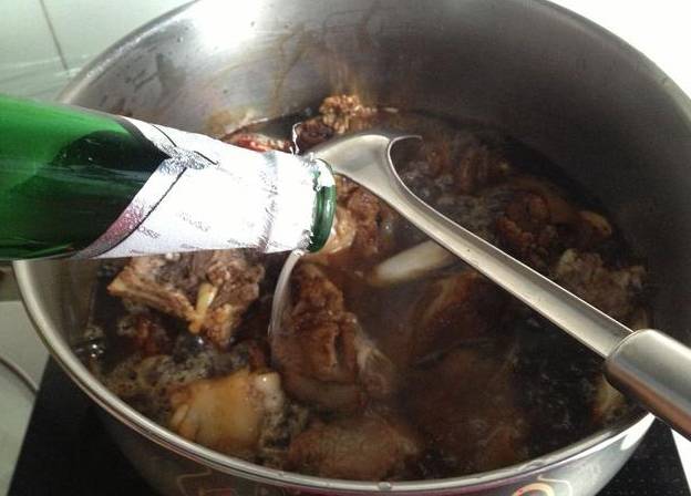 8.倒入啤酒(不要加水,全部倒啤酒,要没过羊肉),浸没羊肉,大火煮开后改小火焖1小时半左右