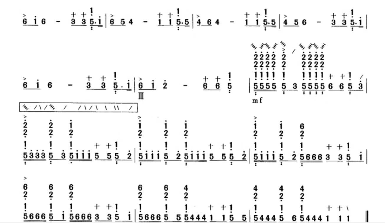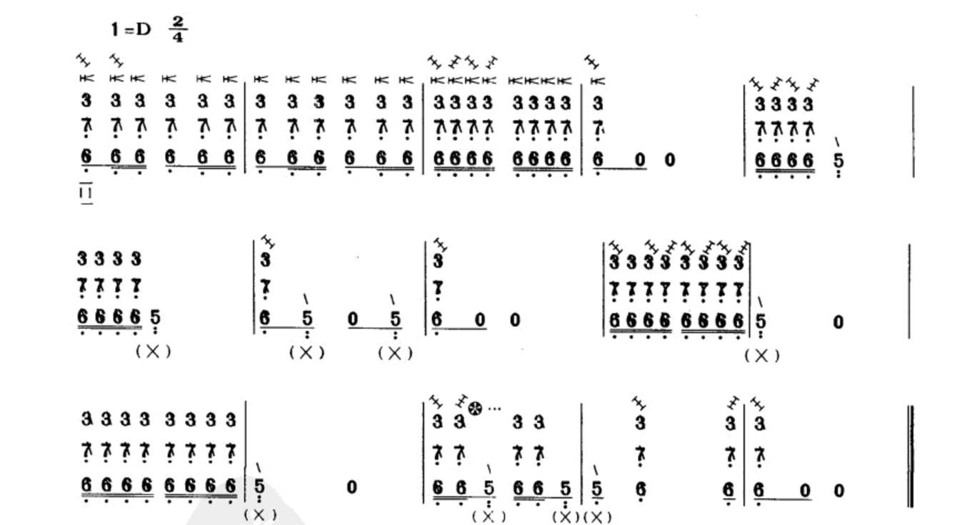 噪音类指法相对简单,但能表现出良好的特殊音响效果,在使用时,要注意配合好乐曲表达的情绪不能过分炫技或滥用。