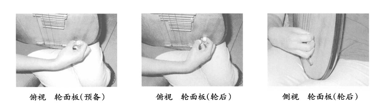 轮板——由右手小指、环指、中指、食指逆次在面板上弹击,或食指、中指、环指、小指顺次在面板上弹击,发出“哒哒哒哒”声,其一般用来表现马蹄声。基本方法与弹面板相同,前者发一声,后者发四声。