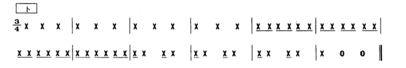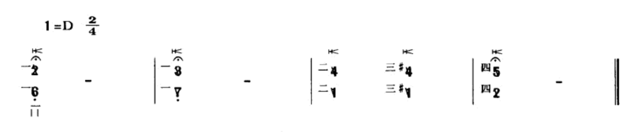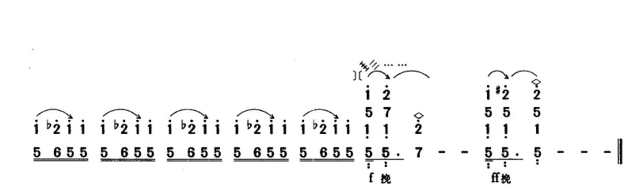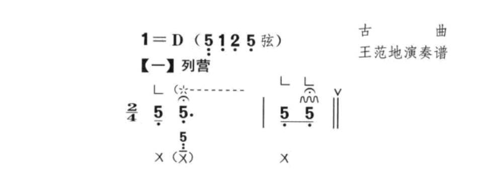 注:(1).左手指将一弦推入二弦下面,并将二弦挽出,使之与一弦交叉,得非纯粹乐音。
