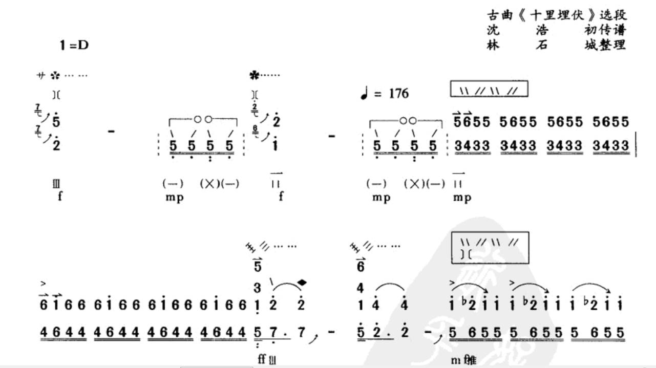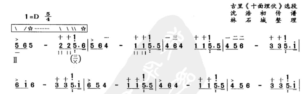注:用大、食指摘起一弦即放,作断弦声。每一声都要干净利落。因“提”所发出的音,并不是纯粹乐音,所以乐谱上标出它的音高同时,用斜线削去。
